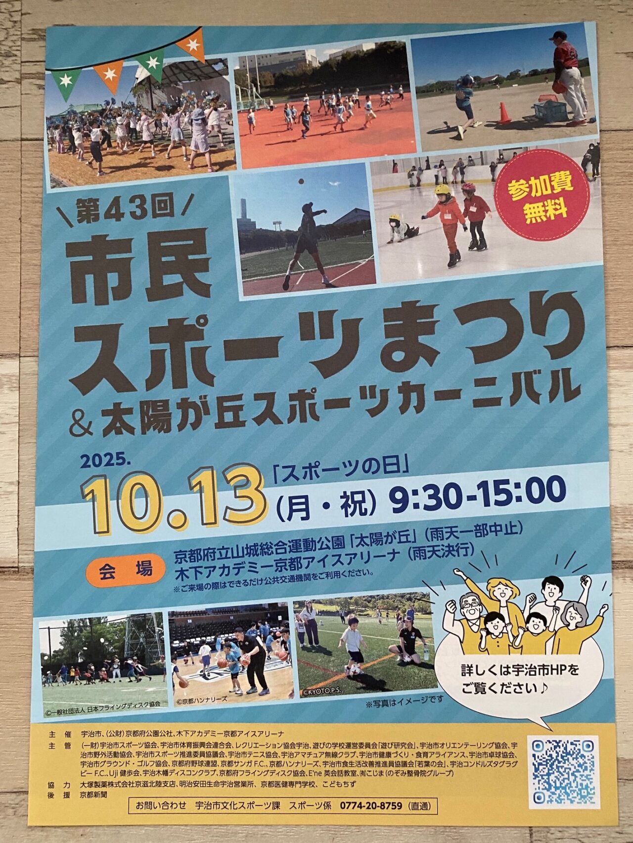 宇治市の秋の恒例イベント「第43回 市民スポーツまつり」が、令和7年10月13日(月・祝)に開催されます。会場は山城総合運動公園「太陽が丘」と木下アカデミー京都アイスアリーナ。時間は9時30分から15時まで、参加費は無料です。