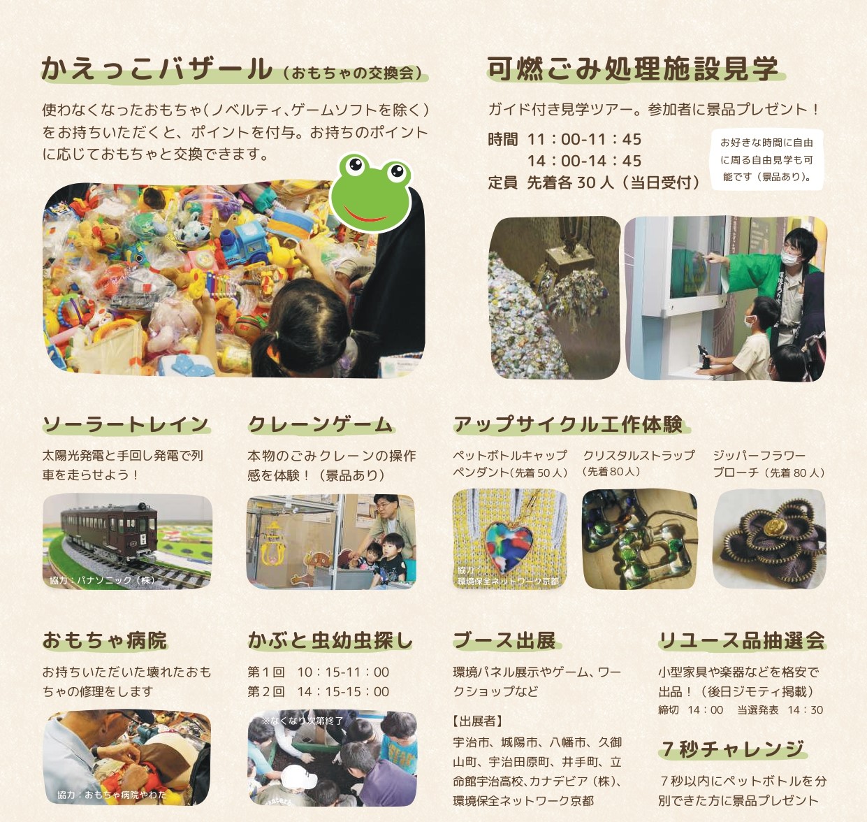 そのほか、ソーラートレイン・クレーンゲーム・アップサイクル工作体験など、環境を楽しく学べる1日。子どもから大人まで楽しめる企画が盛りだくさんです。