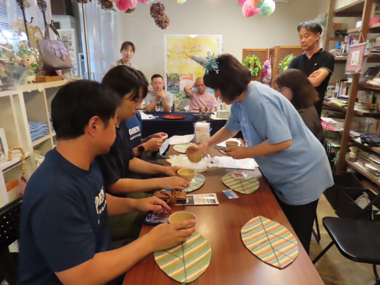 来店したお客さんは、福祉の園の利用者さんが点てたお抹茶と、園で作られたお菓子・器を一緒に味わいながら、笑顔で会話を弾ませていました。