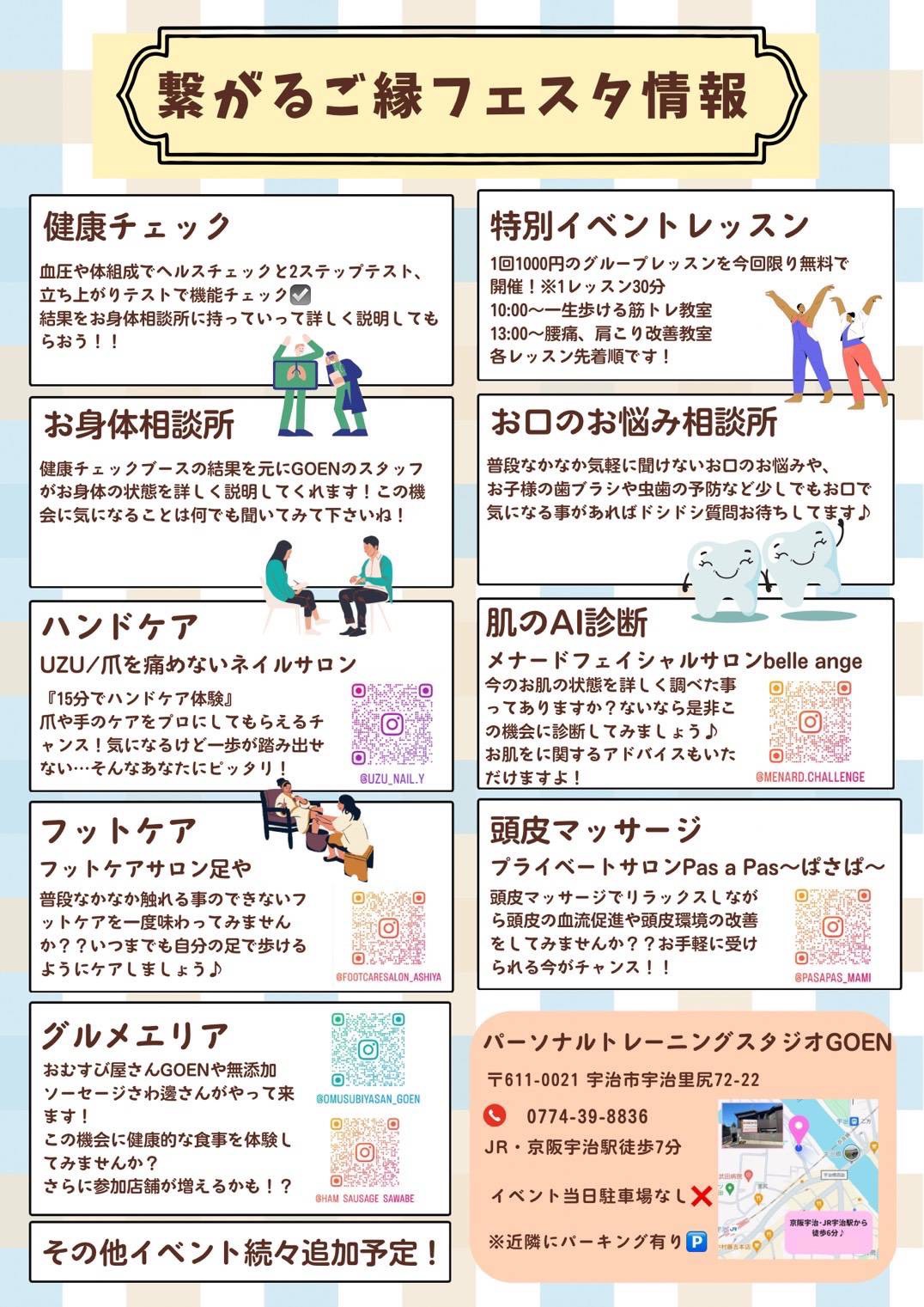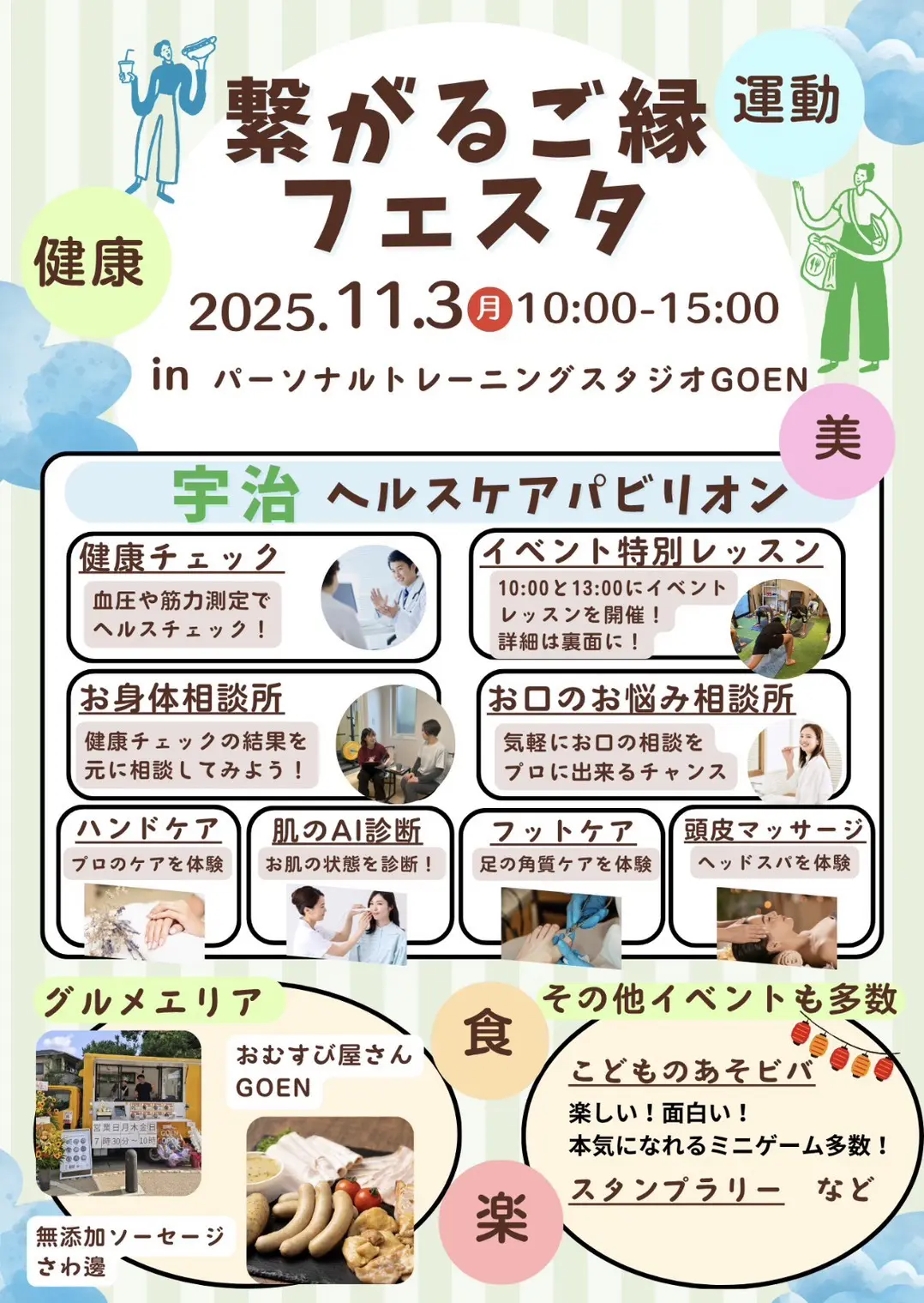 2025年11月3日(月・祝)10時~15時、宇治市のパーソナルトレーニングスタジオGOENにて「繋がるご縁フェスタ」が開催されます!