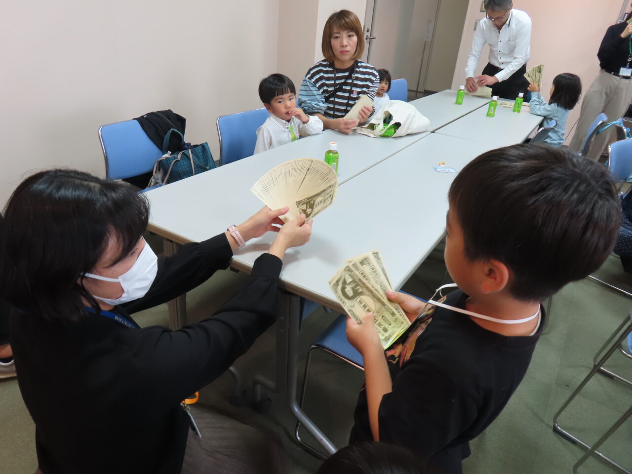 「おかねをかぞえよう」では、銀行員さんならではの、お金を扇のように広げる数え方を伝授。