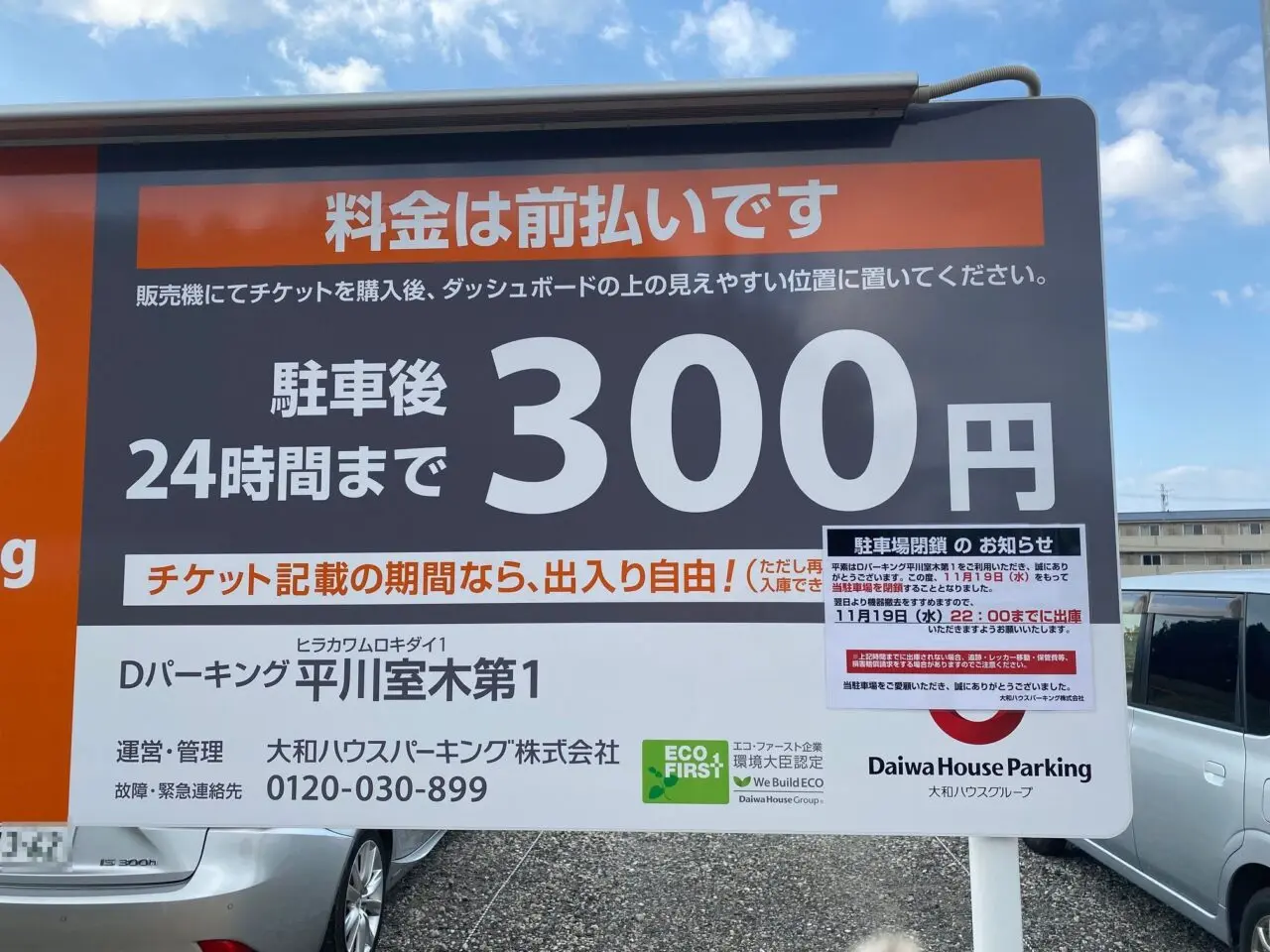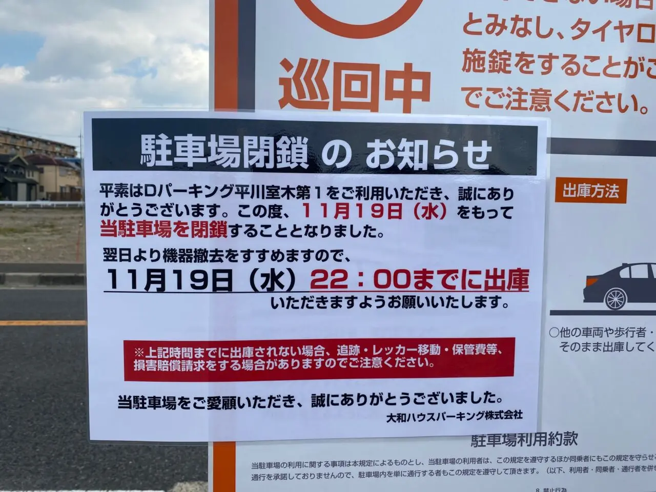 そこには「駐車場閉鎖のお知らせ」として、「11月19日(水)をもって当駐車場を閉鎖することとなりました」と書かれていました。