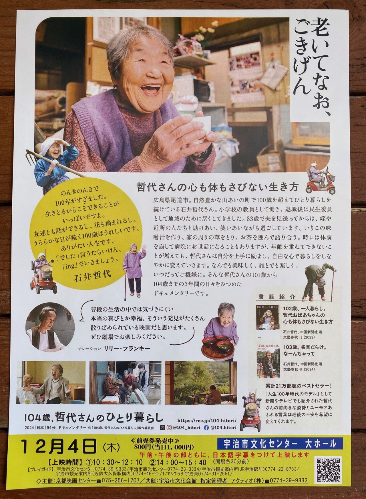 宇治市文化センター・大ホールで、心温まるドキュメンタリー映画「104歳、哲代さんのひとり暮らし」 が上映されます。