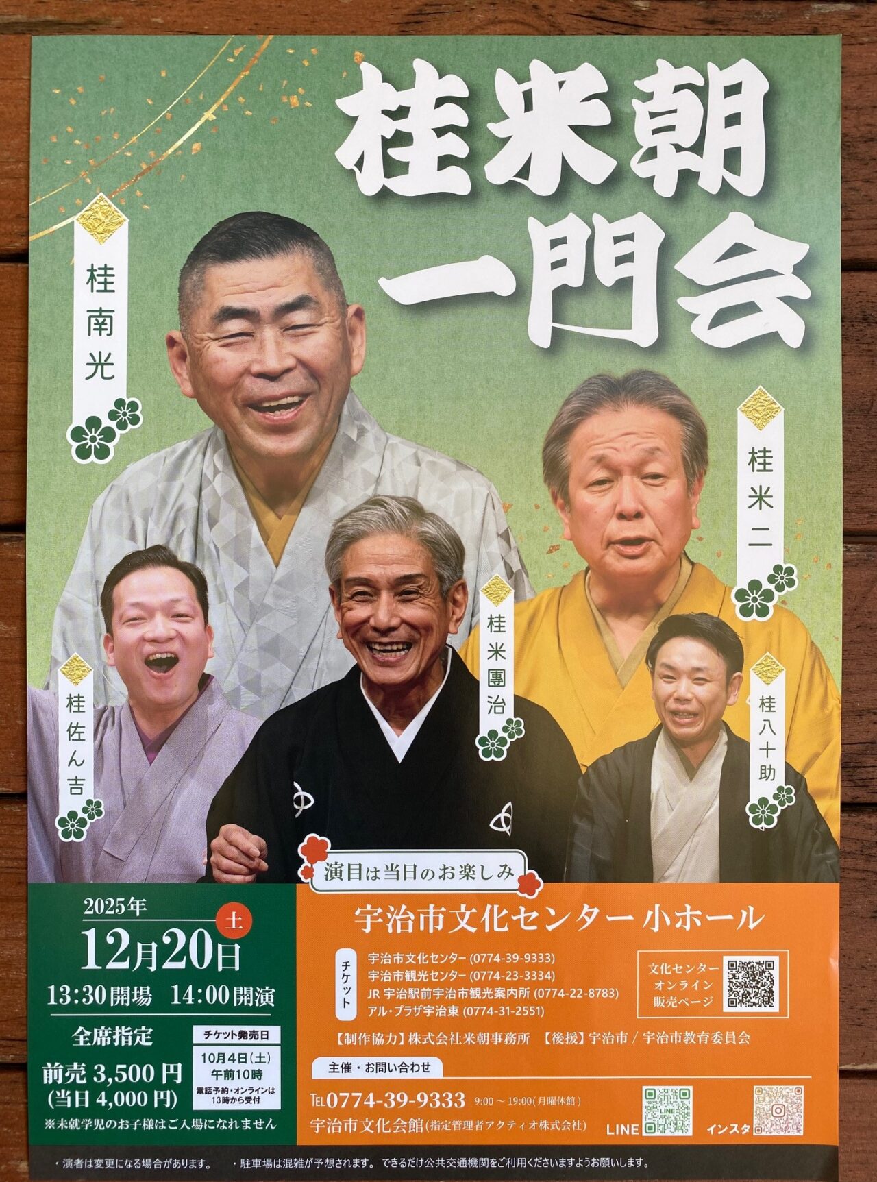 2025年12月20日(土)、宇治市文化センター・小ホールにて、「桂米朝一門会」が開催されます。