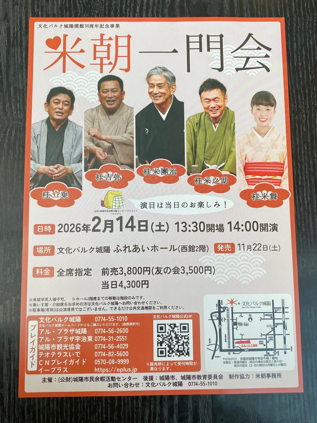 【城陽市】米朝一門の話芸を堪能。2月14日「米朝一門会」がふれあいホールで開催されます