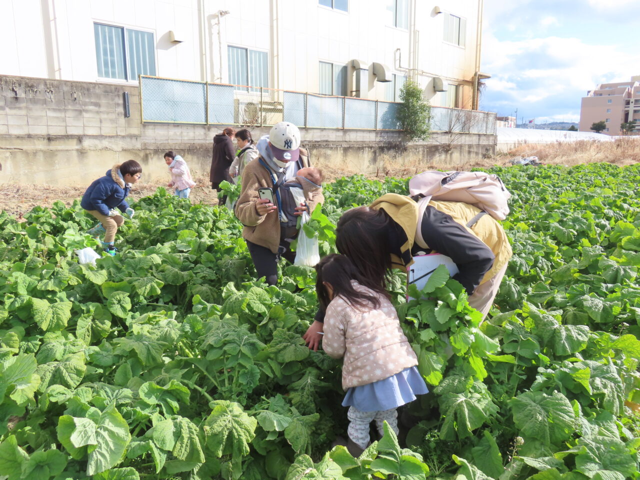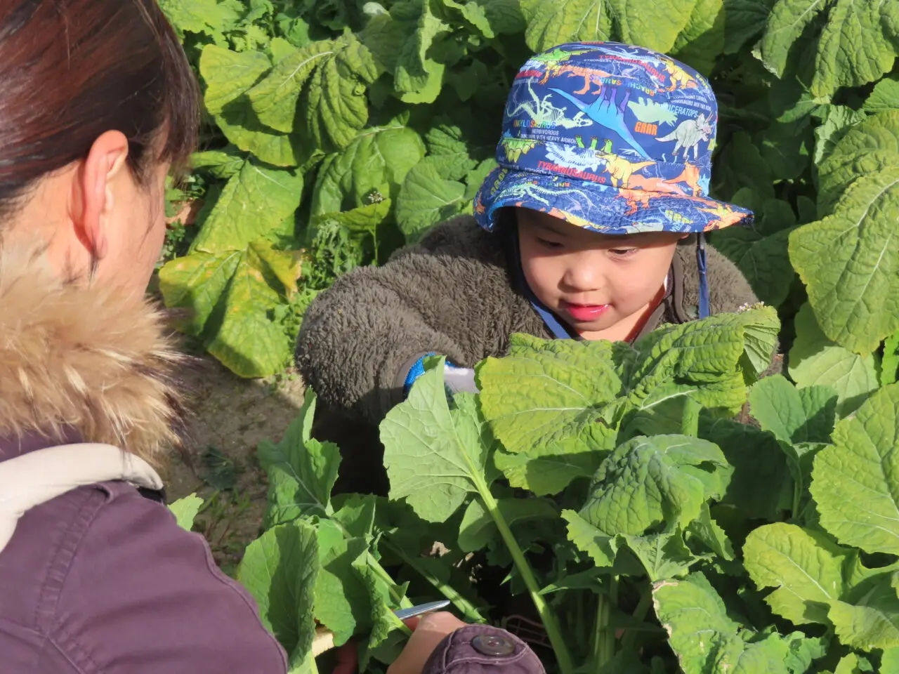 収穫体験では、「元気な葉を見つけてください」「宝物探しみたいに、よく見てね」といったアドバイスを受け、子どもたちは目を輝かせながら畑へ。保護者の方も一緒になって、土に触れ、野菜を手に取る貴重な時間を楽しまれていました。