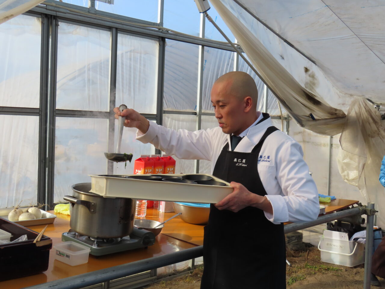 収穫後は、ビニールハウス内に準備された“青空レストラン”へ移動。まずは菜の花を生のまま試食し、その後、柔らかく炊き上げた小かぶに温かい餡をかけた一品と、菜の花のおひたしがふるまわれました。