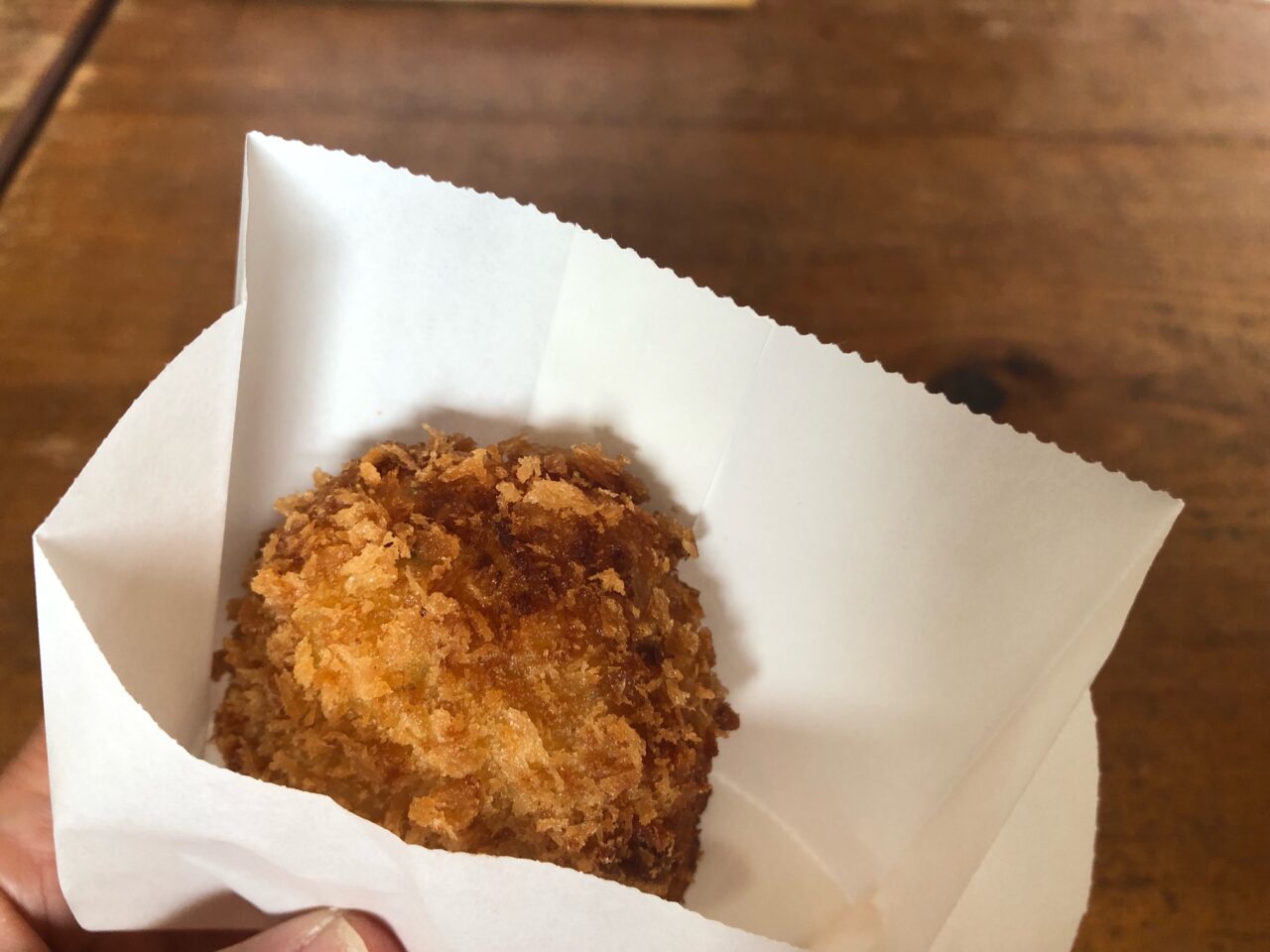 じゃがいもと豚肉のおいしいコロッケに、刻んだ乾梅干しが入っています。ほんのり梅の香りがして郷愁を誘うお味~。