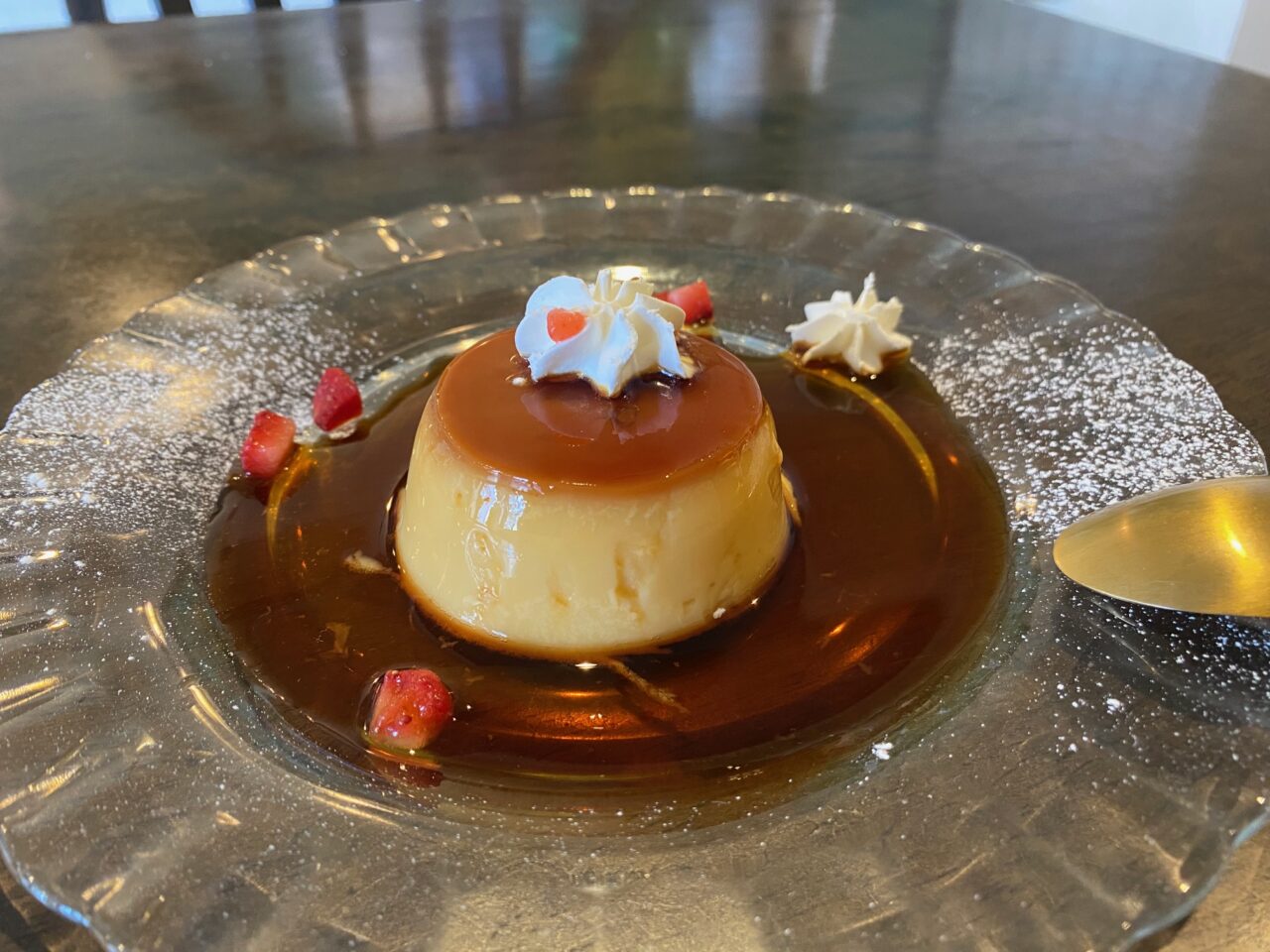 手作りのプリンは、昨今の流行りのやわらか~いプリンと、昔ながらの固めのプリンのちょうど間くらいの食感。カラメルとクリームやベリーでセンス良く飾られたひと皿に、思わず笑みがこぼれます。