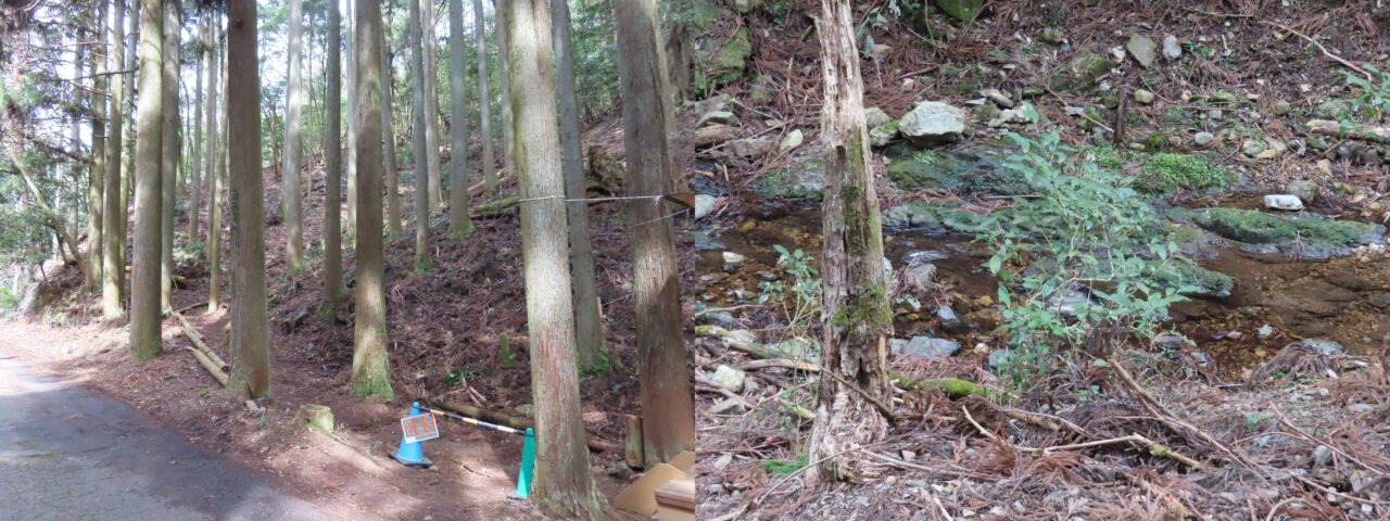 笠取小学校から車で数分、歩いて10分程度の場所にある、自然いっぱいの林です。右手には大木が茂り、左手には小川が流れる…そんな場所。