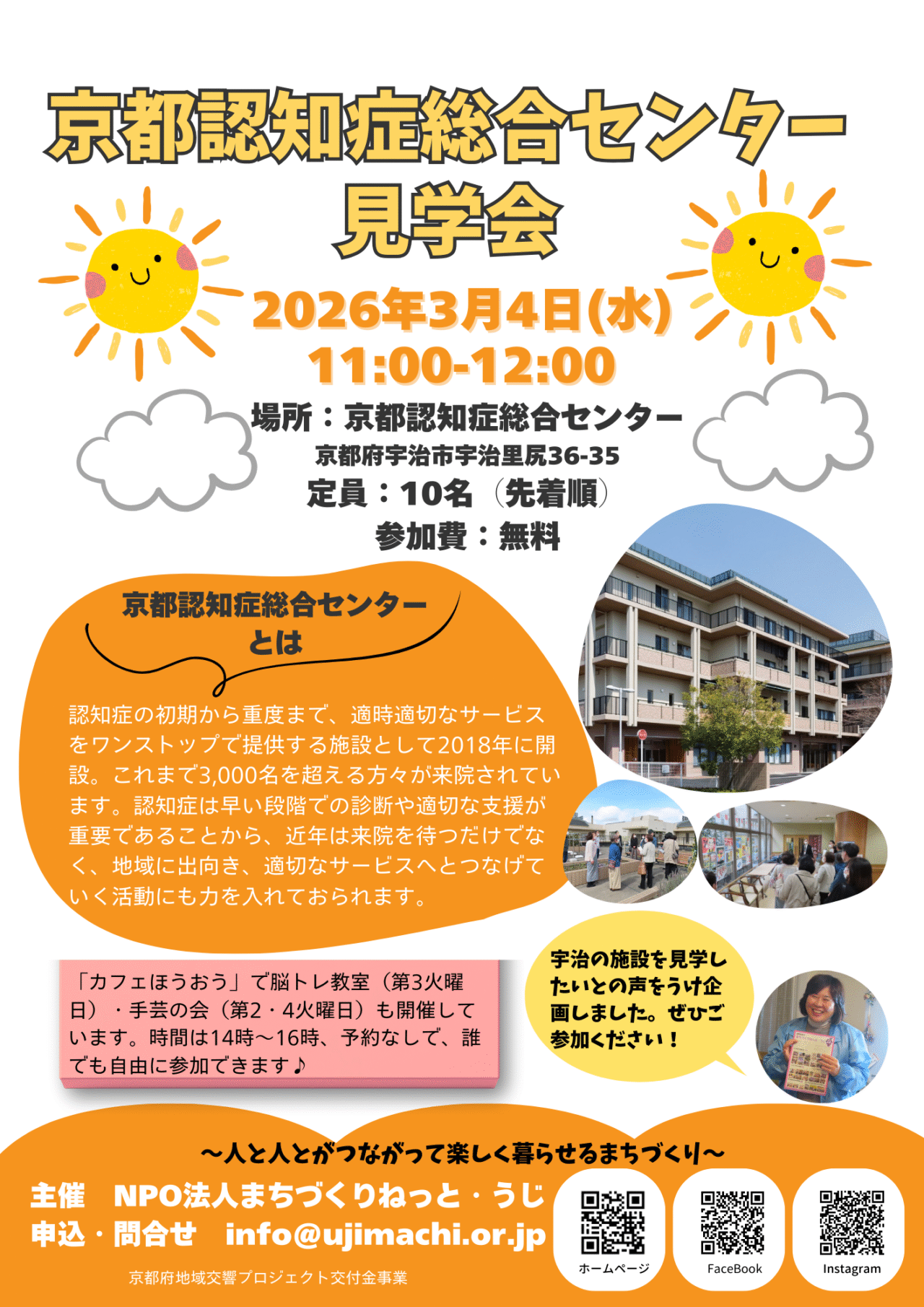 2026年3月4日(水)、京都認知症総合センターの見学会が開催されました。主催したのは、「人と人とがつながり楽しく暮らせるまちづくり」に取り組むNPO法人まちづくりねっと・うじです。